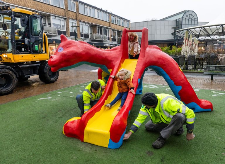 Na zijn winterslaap is de drakenglijbaan afgelopen dinsdag weer teruggekomen naar het Sint Jorisplein. Kinderen kunnen er weer jarenlang veilig op spelen.