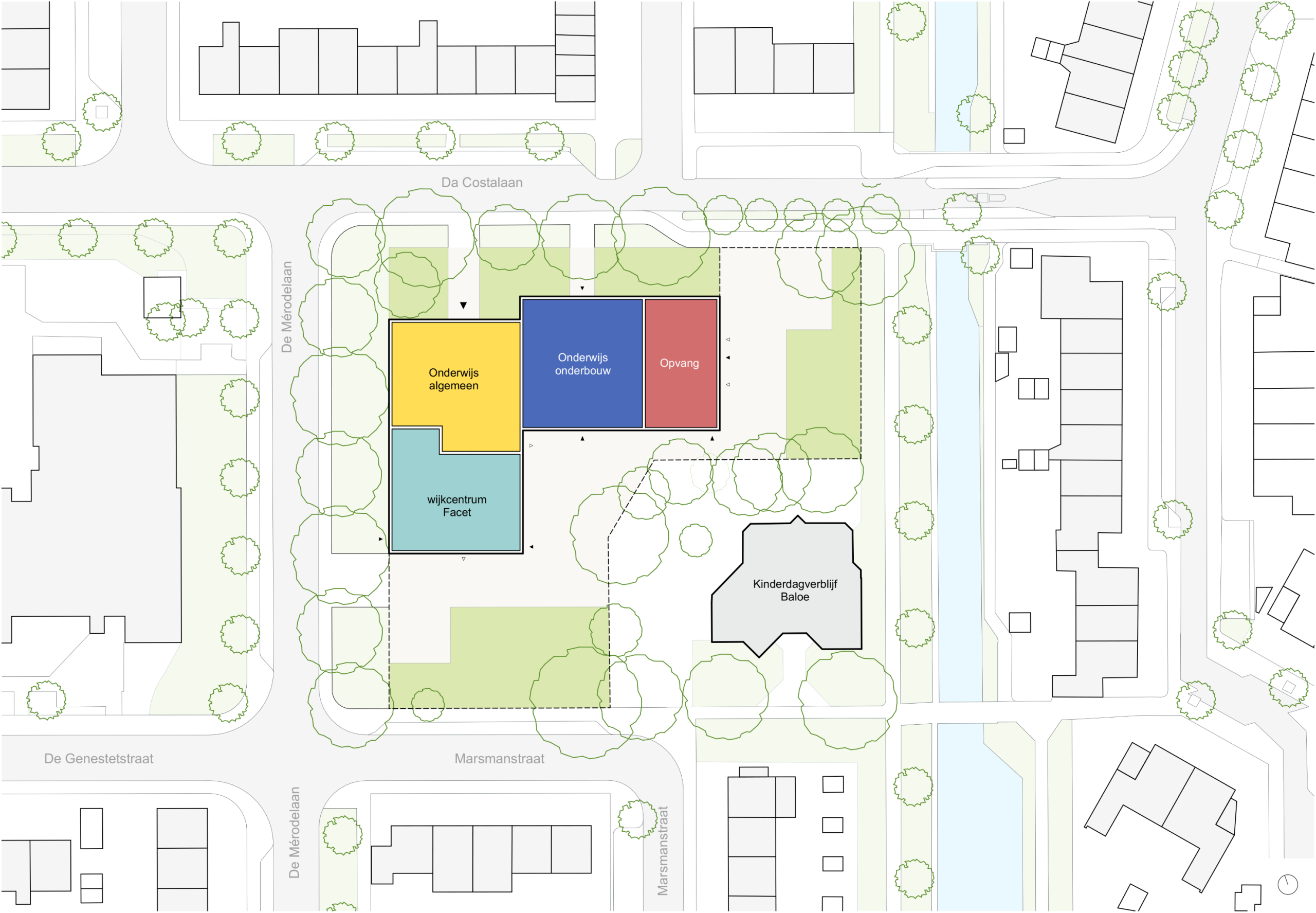 De linkervleugel ligt iets verder terug ten opzichte van de Da Costalaan, zodat er een entreeplein ontstaat. In deze vleugel bevinden zich de algemene functies van de school, zoals de centrale hal, speellokaal en teamkamer. Het wijkcentrum Facet bevindt zich aan de De Mérodelaan en krijgt hier zijn eigen entree.