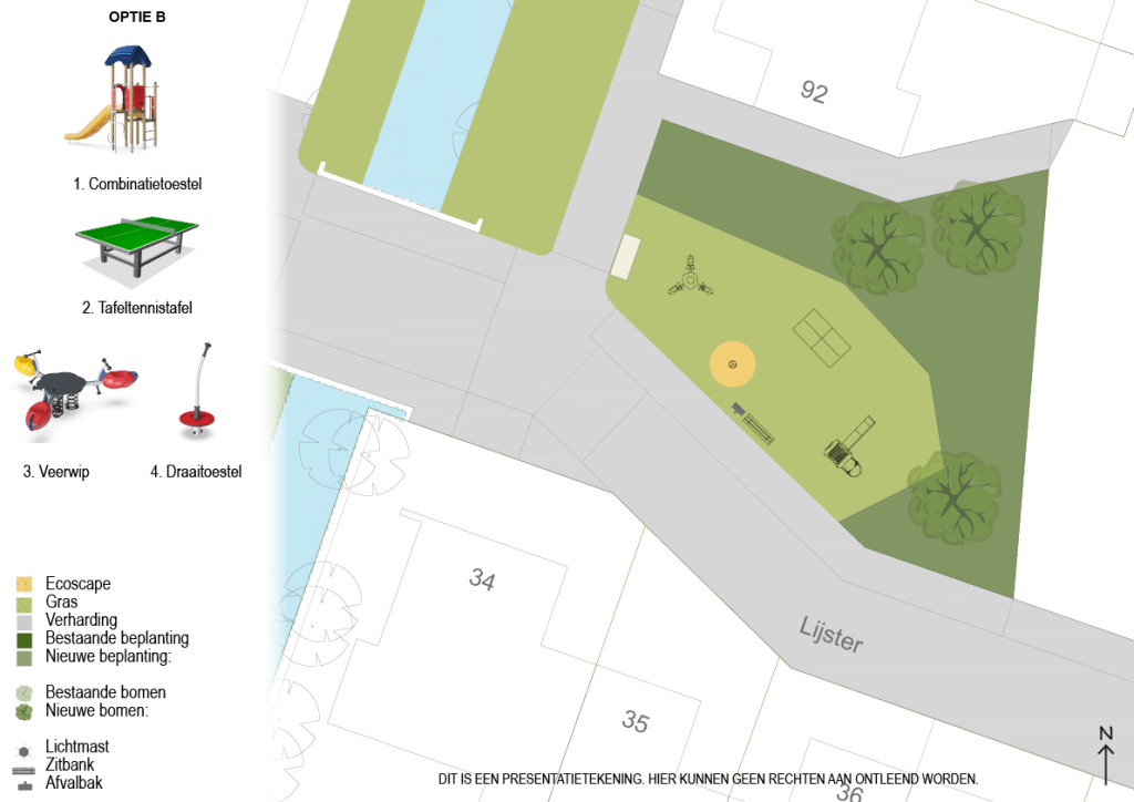 Er zijn in totaal 14 stemmen uitgebracht. Optie B heeft met 9 stemmen gewonnen. Dit ontwerp bestaat uit een combinatietoestel met glijbaan, een veerwip en een draaitoestel. Voor de oudere kinderen plaatsen wij een tafeltennistafel. Ook wordt er een bankje aan toegevoegd.