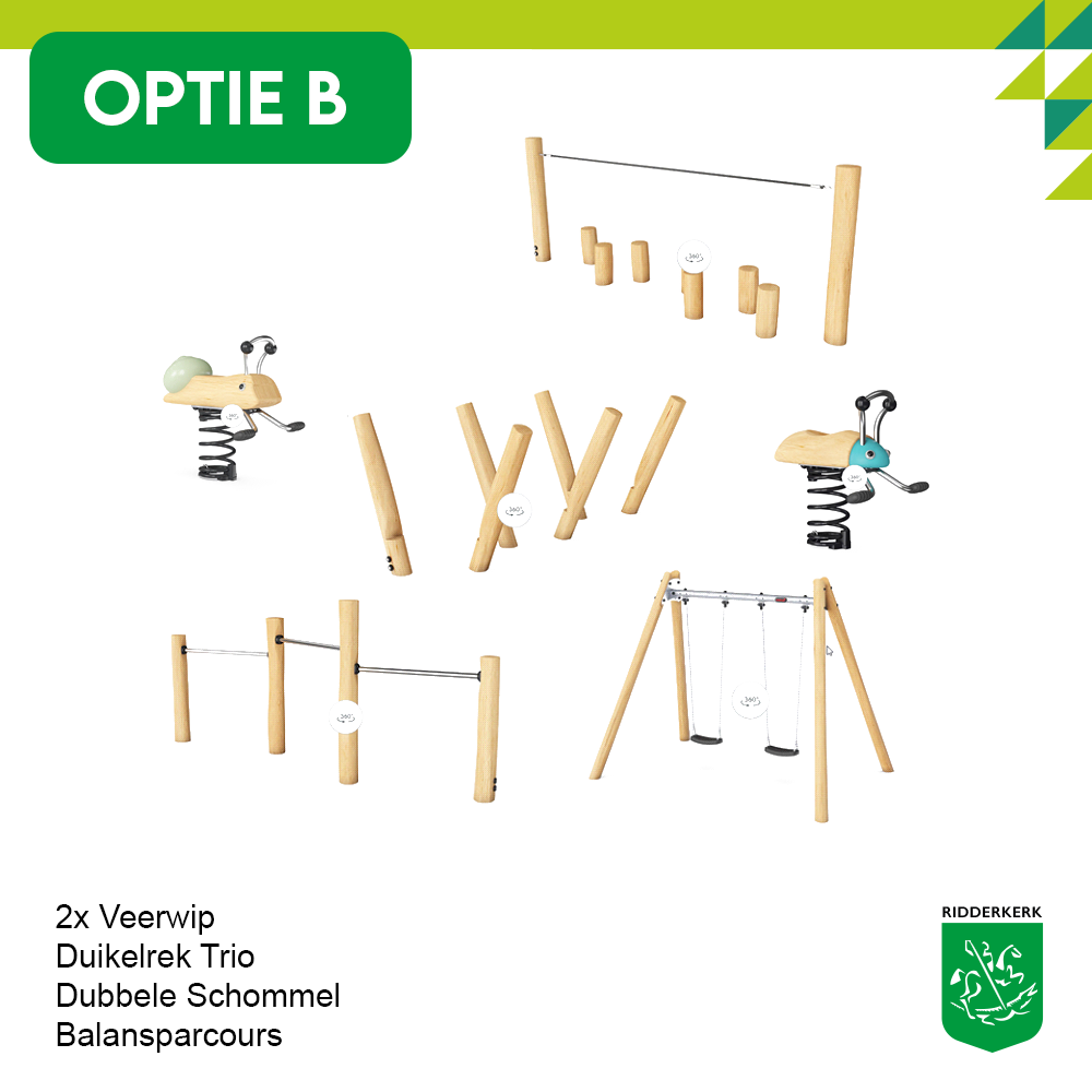 Er zijn in totaal 35 stemmen uitgebracht! Optie B heeft met 28 stemmen gewonnen. Dit ontwerp bestaat uit een balanceerparcours, veerwippen een trio duikelrek en een dubbele schommel in natuurlijke uitstraling.